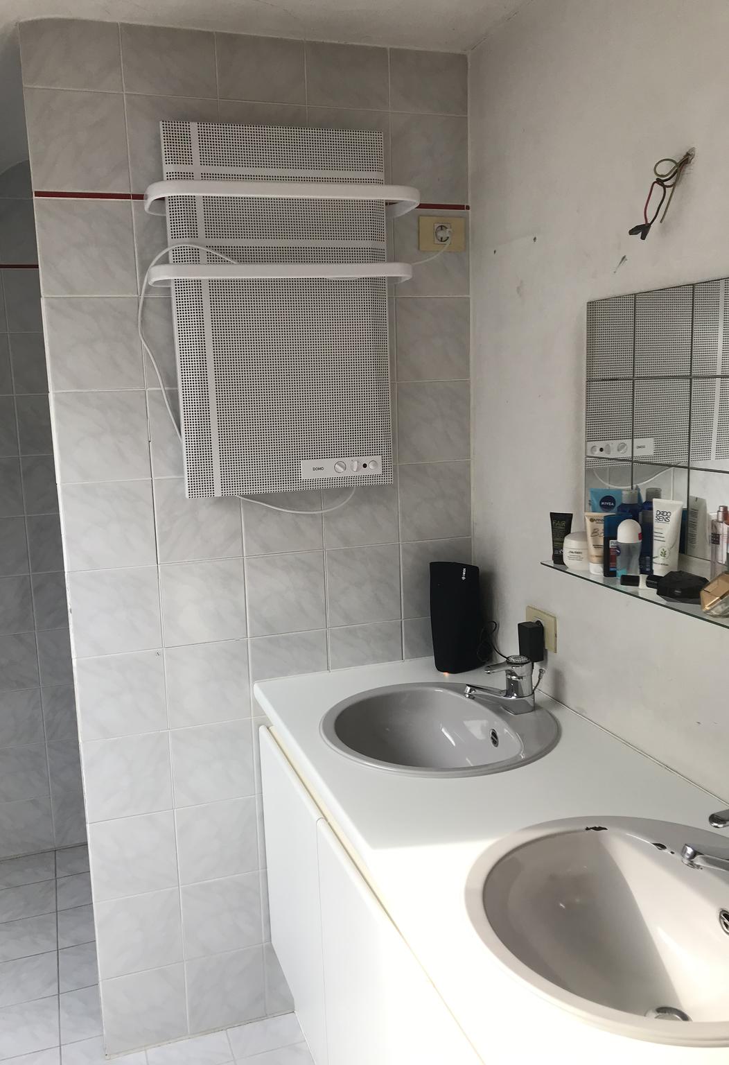 En hoe praktisch kan een badkamer zijn? 1 wasbak voor het ganse gezin! Ondertussen is er plaats om een ververskussen te leggen of om de make-up aan te brengen of je haar te drogen/stylen.