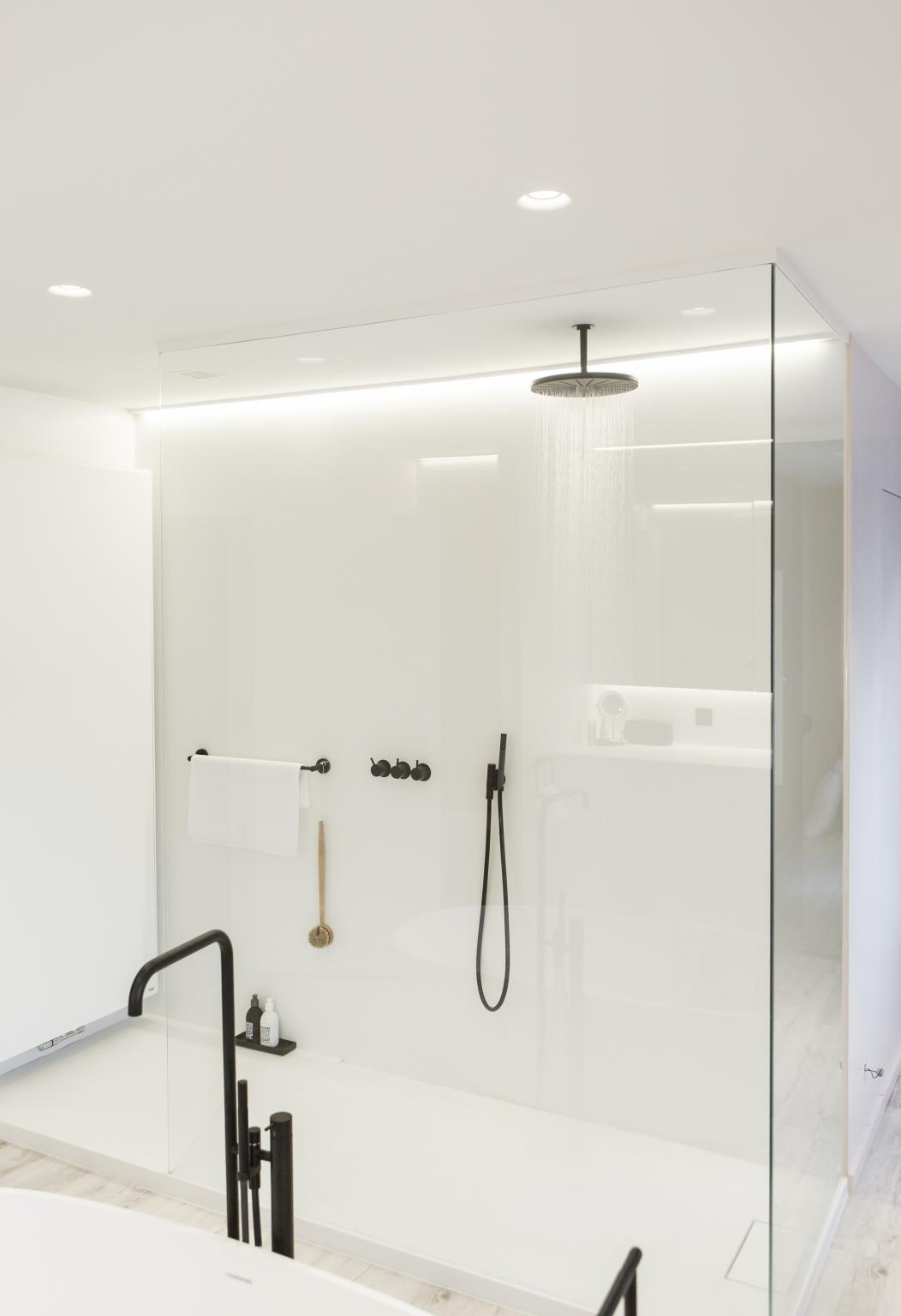- Ruime inloopdouche in solid surface met glaswand van vloer tot plafond, vola kraanwerk, een ledstrip en een vlakke radiator met handdoekbeugel bij instappen van de douche