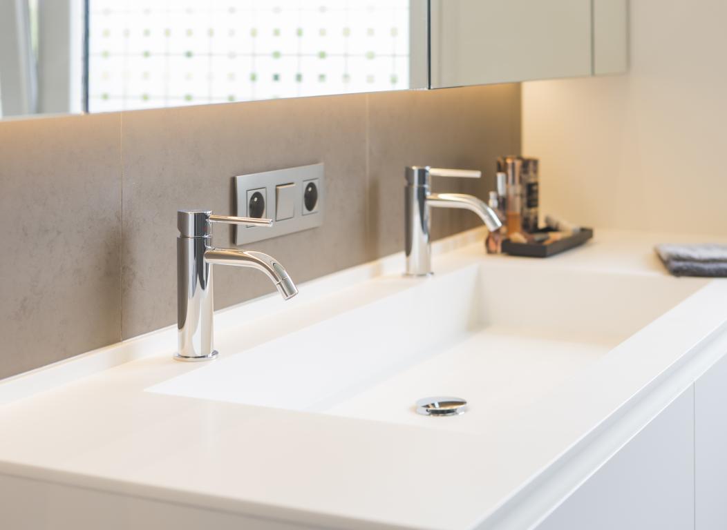 - Bovenblad in solid surface met 1 lange ingewerkte waskom.