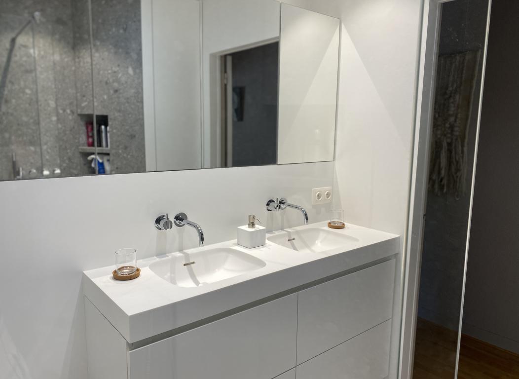 Een van de eerste dingen die verdween in deze oude badkamer? Het bad met douchekop. Dat nam erg veel plek in. Bovendien zorgde het door zijn robuuste karakter voor een optische verkleining van de badkamer. Om het open gevoel terug in de badkamer te krijgen én om de bewoners meer comfort te gunnen, werd er gekozen voor een haast naadloze inloopdouche.