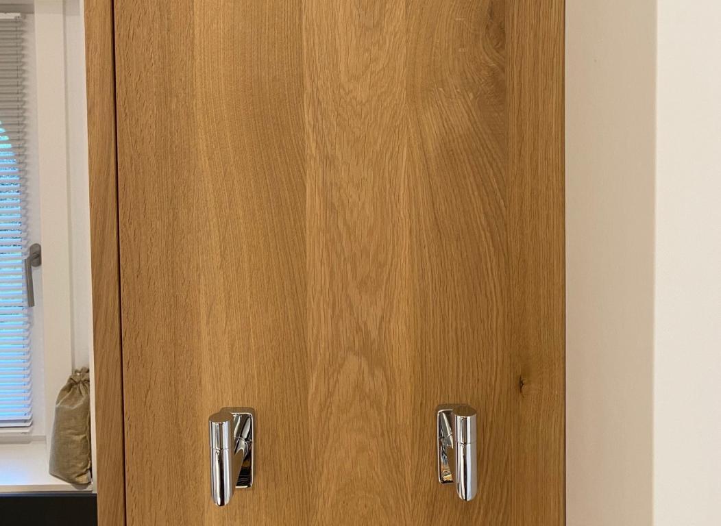 Voor het meubel werd gekozen voor een klassiek eikenhouten kast met blauwsteen tablet; Tijdloze creatie